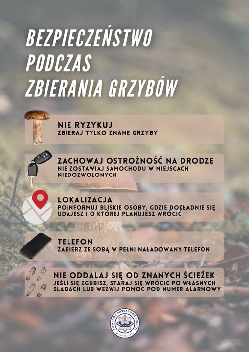 Sezon grzybowy w pełni, a ładna, jesienna pogoda zachęca do spacerów po lesie. Policjanci z Komendy Powiatowej Policji w Choszcznie przypominają jednak, że oprócz koszyka i nożyka warto zabrać ze sobą również zdrowy rozsądek. Każdego roku odnotowujemy przypadki zagubień w lesie, a także zatrucia grzybami, dlatego apelujemy o ostrożność i odpowiedzialne zachowanie.