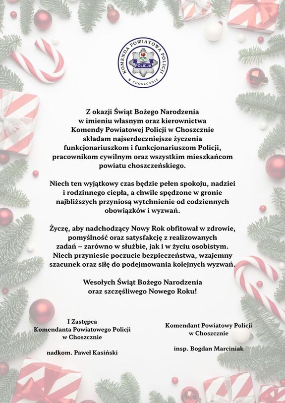 Komendant Powiatowy Policji w Choszcznie składa wszystkim funkcjonariuszkom i funkcjonariuszom, pracownikom cywilnym oraz mieszkańcom powiatu choszczeńskiego serdeczne życzenia spokojnych, rodzinnych i bezpiecznych Świąt Bożego Narodzenia oraz pomyślności w nadchodzącym Nowym Roku.