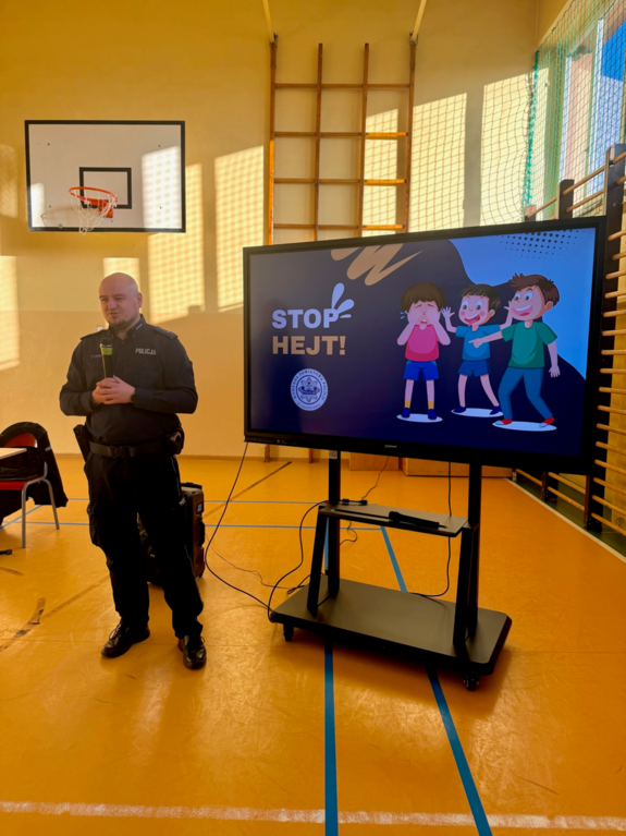Dzielnicowy mł. asp. Patryk Sieluś odwiedził uczniów Szkoły Podstawowej nr 3 w Choszcznie, gdzie przeprowadził spotkanie profilaktyczne pod hasłem „Stop hejt”.