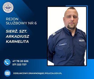 Sierżant sztabowy Arkadiusz Karmelita to policjant, który każdego dnia z pełnym zaangażowaniem dba o bezpieczeństwo i spokój mieszkańców gminy Drawno