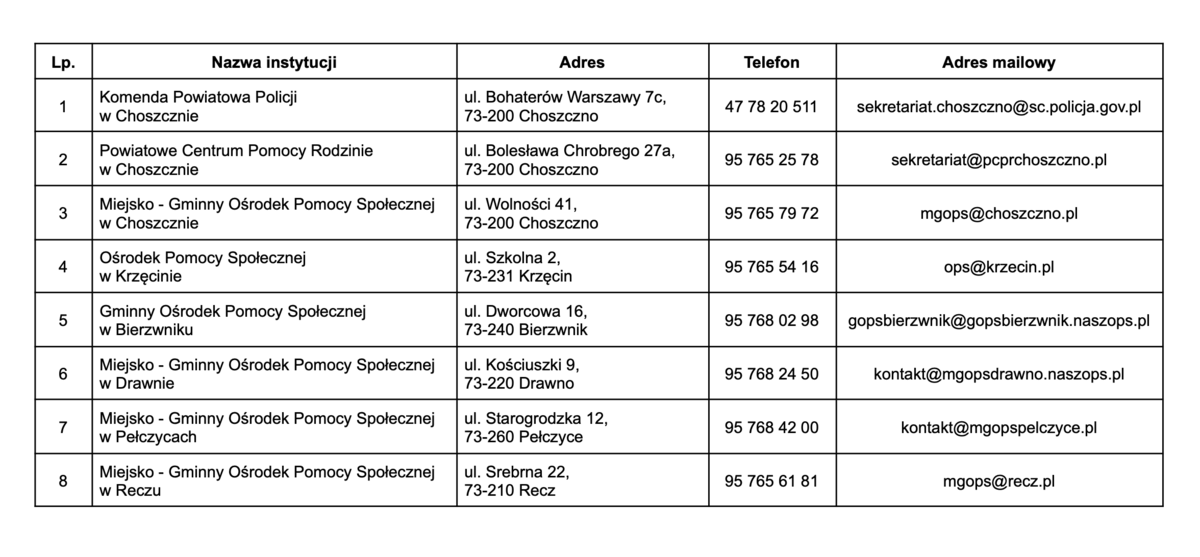 LOKALNE PLACÓWKI UDZIELAJĄCE POMOCY OFIAROM PRZEMOCY Powrót Drukuj LOKALNE PLACÓWKI UDZIELAJĄCE POMOCY OFIAROM PRZEMOCY